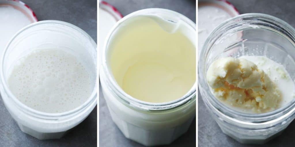 Whichever method you use, you will have to wash the butter. Separate the solids from the liquids by using a fine sieve or cheesecloth. You can keep the buttermilk to use in other recipes like pancakes or kaiserschmarrn.